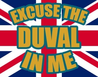 Heading to the UK for the Jaguars Game this October or tailgating at home that morning with friends and fans alike... Turn heads and rep your roots in style with our "Excuse the Duval in Me" UK tee—now in a fresh gold and teal outline combo over the Union Jack! This limited-edition colorway pops with street-savvy attitude and hometown pride. Printed on a premium black cotton tee, this design blends comfort with bold expression.